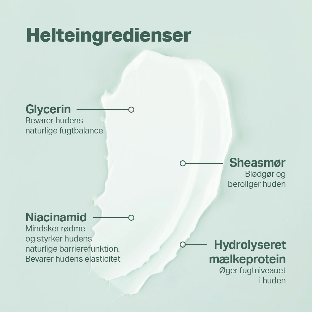 Cremen har en rig og blød konsistens, der bl.a. skyldes det høje indhold af sheasmør, som giver fugt og har en beroligende virkning på tør hud. Indholder også 3% niacinamid, der reducerer rødme og irritation.